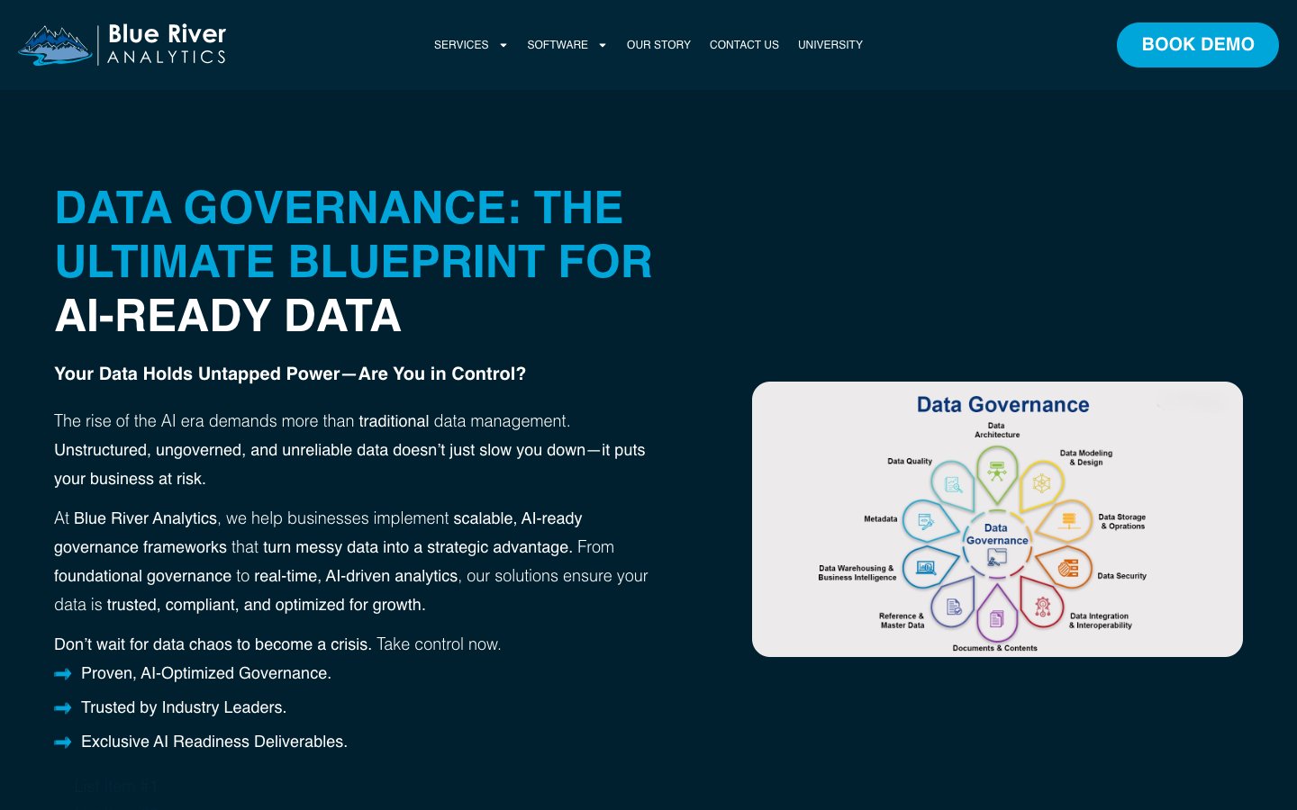 The homepage emphasizes the company's core offerings, showing a commitment to solving data challenges through customized service packages. Potential clients are invited to address their specific needs, from data management gaps to comprehensive data governance frameworks, directly aligning with client-specific demands. By promoting its industry-specific services, particularly for the energy sector, Blue River Analytics aims to position itself as an expert in delivering analytical solutions that cater to niche markets.