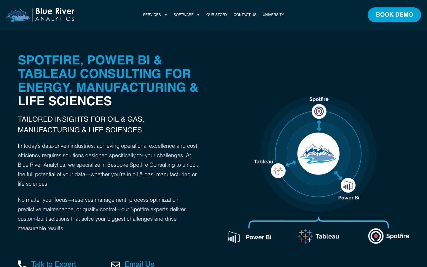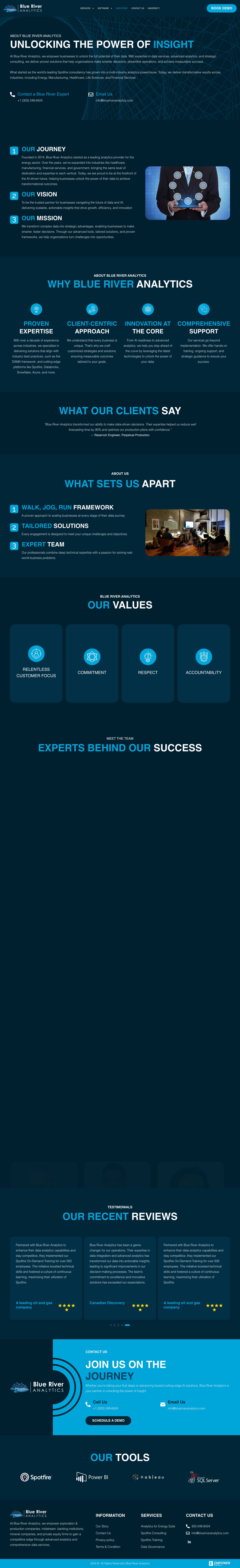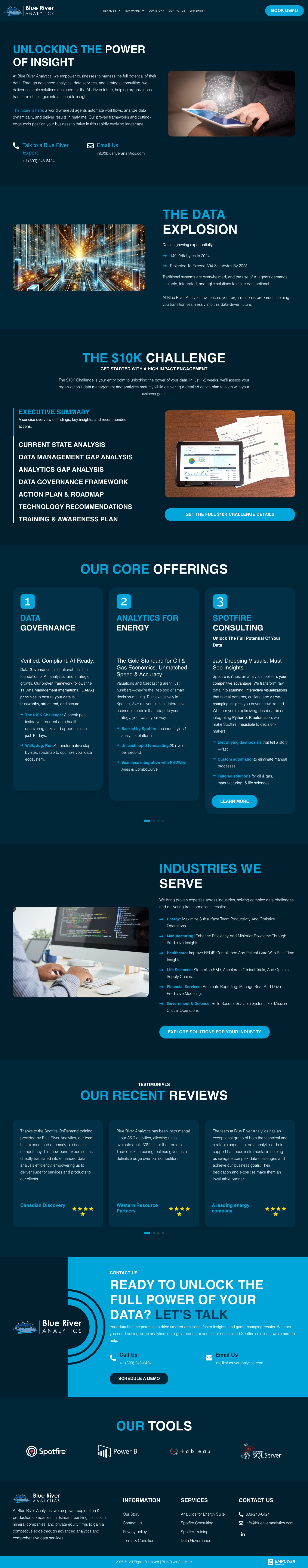 Blue River Analytics is focused on providing comprehensive data solutions to help organizations unlock insights from their data. The website highlights its expertise in data governance, analytics tailored to the energy sector, and Spotfire consulting services. The target audience includes businesses seeking to optimize their data management and derive actionable insights to drive strategic decisions. The company positions itself as a strategic partner for organizations grappling with the challenges posed by the explosive growth of data, providing tailored frameworks and consultation to harness data effectively.